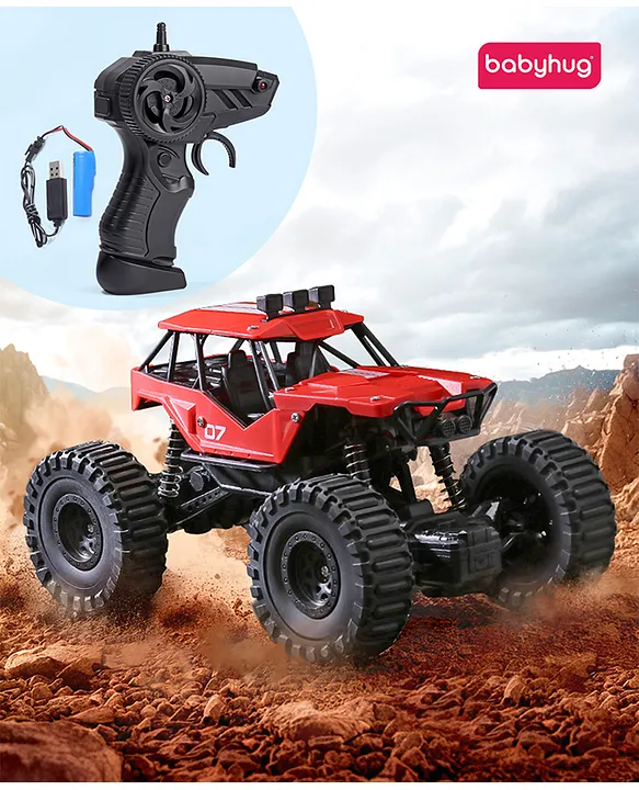 - Babyhug Off Roader 1:18 Four Funtions Red Rechargeable Rock Crawler RC Car|Big Rubber Wheels|Range Upto 70 Ft.|Shock Absorbers|BIS certified|Gifting Toy
