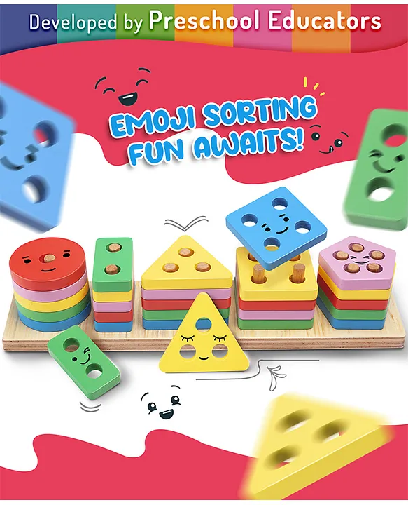 • Intelliskills Stack N’ Sort Premium Wooden Geometric Shapes with Cute Face Emojis Multicolour – 25 Pieces